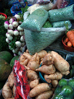 Here are some colorful pictures of the market places where we buy bulk veggies, potatoes, beans and fruits for the teams that we host as well as for the soup kitchen. After you purchase a large sack of items you pay a human carrier to strap your sack on their back and carry it to your vehicle. It is quite impressive to watch a tiny Ecuadorian woman strap your 100 lb sack to her back and carry it as if it weighed nothing! I'm sure this also accounts for the early onset of arthritis and back deformities. We don't buy our meat at the markets (we aren't that brave) but wanted to include a picture of that as well. They sell everything from cow hooves to pig skin, cow stomach lining, live chickens, rabbits, goats and guinea pigs. It is quite an experience but not for those who don't like to be around a lot of people.